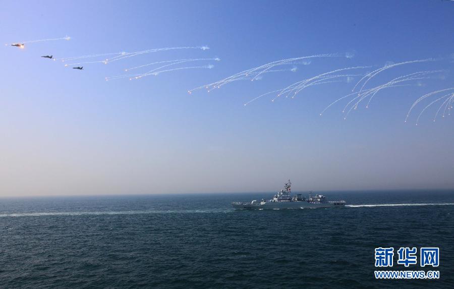 海上閱兵現場(4月26日攝)。 4月26日,參加“海上聯合-2012”中俄海上聯合軍事演習的雙方艦艇、飛機在青島附近黃海海域舉行盛大的海上閱兵儀式。這次海上閱兵主要包括艦艇19艘、飛機19架,采取海上分列式的方式依次通過閱兵艦接受檢閱。海上閱兵是“海上聯合-2012”中俄海上聯合軍事演習的第三階段。此前,中俄雙方已經進行了作戰籌劃、實兵演習等課目的演練。新華社記者查春明攝