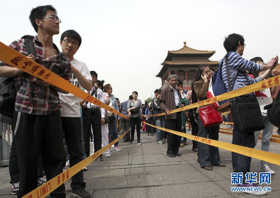 4月28日,游客在北京故宮景區售票處排隊購票。為應對“五一”期間大客流,從4月29日起至5月1日,故宮提前1小時,即早上7點半向觀眾開放,清場時間仍為下午5點。在端門區域增開臨時售票窗口9個,使售票窗口達到25個,并專設旅行社團隊售票窗口,以調控售票速度,緩解游客排隊購票壓力。在此期間,將根據故宮內客流情況,采取現場暫停售票等臨時限流措施。通過網上預售票系統購票游客將優先放行進入故宮。新華社發(鈕一新 攝)