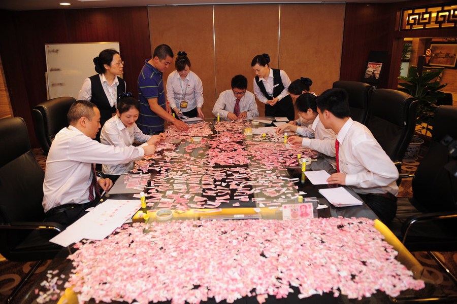 5月3日清晨6點,四川成都市民林兆強抱著5萬元百元鈔碎片,從成都金堂趕到中國銀行四川省分行,尋求幫助。5月1日,林兆強妻子突然發病,將5萬元救命錢撕成碎片。面對數千塊鈔票碎片,12名銀行工作人員分揀、拼接了6小時,才艱難拼出一張百元鈔票。剩下的錢一旦拼接不出來,就面臨作廢的無奈。因為這筆錢是準備用來給妻子治精神病的,林兆強表示不會放棄。華西都市報