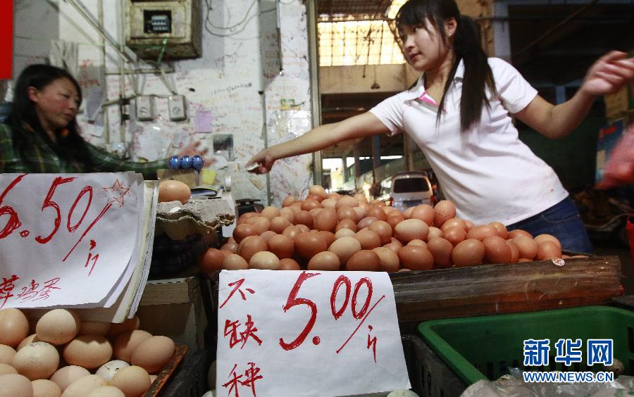 6月5日,上海農產品中心批發市場一個攤位的每斤雞蛋零售價已經達到5元,比6月3日又上漲了0.2元。近日,全國多個城市雞蛋價格出現快速上漲。記者在上海農產品中心批發市場了解到,短短兩個星期,該市場每斤雞蛋的批發價飆升了1.2元,并且尚未出現止穩的勢頭。這讓許多市民都感到“不可思議”,甚至有網友戲稱雞蛋成了“火箭蛋”。業內人士認為,虧損所導致的蛋雞存欄數量減少、夏季高溫來臨蛋雞產蛋能力下降、端午節來臨需求集中釋放、養殖戶惜售等都成為近期蛋價飛漲的原因。新華社記者 裴鑫 攝