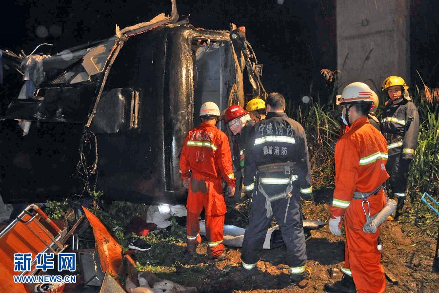 6月20日凌晨,消防人員在車禍現場救援。當日2時許,一輛從無錫開往廈門的大巴閩DY5719行經福建省寧德市霞浦縣境內沈海高速公路牙城段隴頭高架橋時側翻墜入50余米的深谷。據霞浦縣委書記楊培欽介紹,車上共有45人,其中死亡17人、重傷3人,其余人員生命體征平穩,傷員已送到當地醫院搶救。新華社發(唐海波 攝)