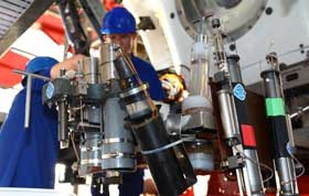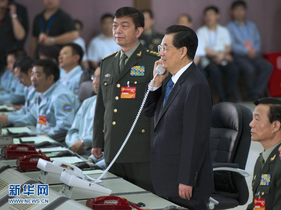 6月26日,中共中央總書記、國家主席、中央軍委主席胡錦濤在北京航天飛行控制中心,同神舟九號航天員景海鵬、劉旺、劉洋親切通話。新華社記者 馬占成 攝