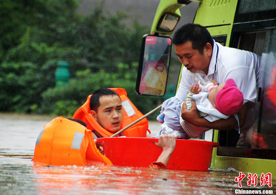 受連日席卷湖南大部的強降雨影響,209國道花垣(湖南湘西州西北部)至保靖(湘西州中部)段多處積水,致路面洪流滾滾,車行艱難。6月27日,一輛由湘西永順澤家開往吉首的班車行駛至保靖-花垣路段時,因該路段地勢低洼,加上路面積水達1米多深,導致班車發動機熄火,車輛被齊脖的洪水圍困。消防戰士找來澡盆將嬰兒從班車窗口中救出。中新社發 張承印 攝