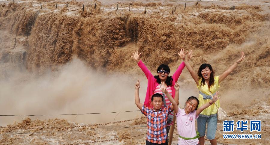 7月2日,游客在山西吉縣黃河壺口瀑布景區拍照留念。當日,為了配合小浪底水庫調水調沙和降低潼關高程,黃河中游萬家寨水庫加大下泄流量,高含沙洪水滾滾而下,黃河壺口瀑布水量猛增,主副瀑布連成一線,寬度達到二百余米,再現壯觀黃色瀑布群,吸引眾多游客前來觀瀑。新華社發(呂桂明 攝)