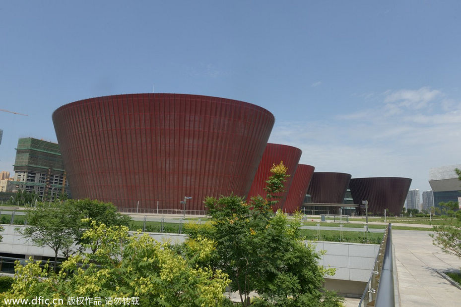 2014年7月12日,山西省太原博物館外景。由于太原博物館由五個橢圓倒錐體形狀的建筑組合而成,其外形及顏色與桶裝方便面的外包裝十分相似,所以被太原市民戲稱為“五桶方便面”“五個大碗面”,成為了太原市的特色建筑物。太原博物館位于太原市長風文化商務區中央文化島上,是文化島大平臺廣場上的標志性建筑之一,前擁汾河,后依內河,北鄰山西大劇院,東鄰山西省科技館。太原博物館總建筑面積64400平方米,其中博物館主體建筑面積52740平方米,平臺建筑面積11660平方米,總投資8.3億元。該博物館建筑方案由法國著名建筑師保羅安德魯(國家大劇院設計者)設計事務所設計,靈感來源于中國紅燈籠,主要建筑為5個相對獨立又相互連通的橢圓倒錐體塊連接組合而成,以中國紅和青銅色為建筑外墻主色調,于2009年9月30日正式開工建設,建設工期為三年,目前即將投入使用。