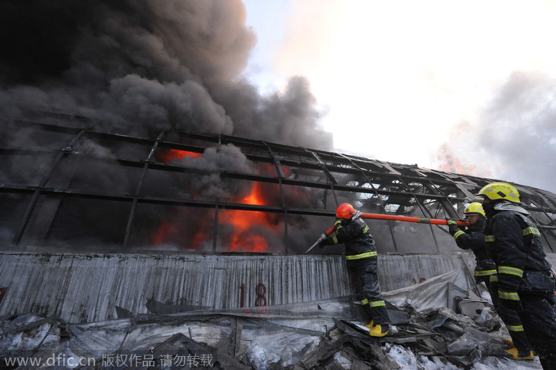 2015年1月2日13時,哈爾濱道外區南勛街與南頭道街附近的一個存放廚具的庫房起火,數公里外可見濃煙。圖為哈市消防支隊現場救援。