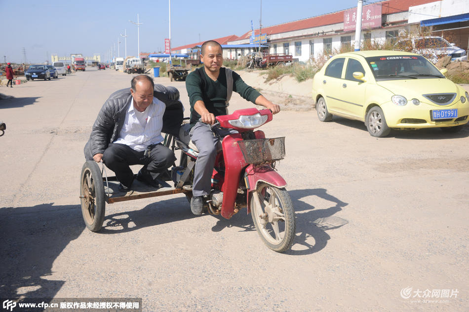 2015年10月3日,山東市東營墾利縣紅光漁港,一名男子將自己的摩托車改裝成三輪摩托車載客,吸引眾多路人的眼球。