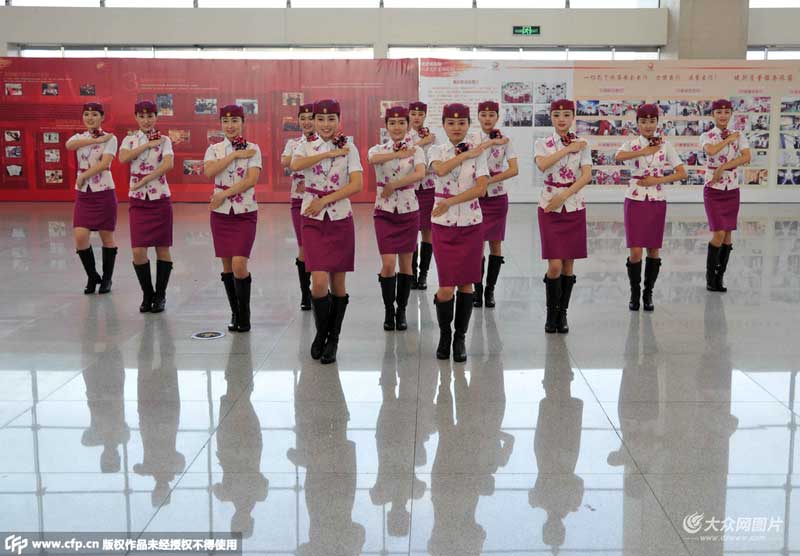 成都鐵路局動車組乘務員在成都東站候車大廳演示服務禮儀。作者:曹寧/CFP