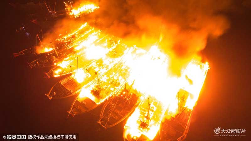 由于事發(fā)凌晨,船上的漁民已返回家中,故火災(zāi)未造成人員傷亡。據(jù)統(tǒng)計,共有8艘漁船和1艘漁排被嚴(yán)重?zé)龤В碛袃伤覞O船燒毀程度較輕。至于起火原因,據(jù)初步了解,事發(fā)時正值農(nóng)歷初一,當(dāng)?shù)厝藭M行一些拜祭活動,或因所燒紙錢飛到船內(nèi)引發(fā)火災(zāi),目前具體原因仍在調(diào)查中。