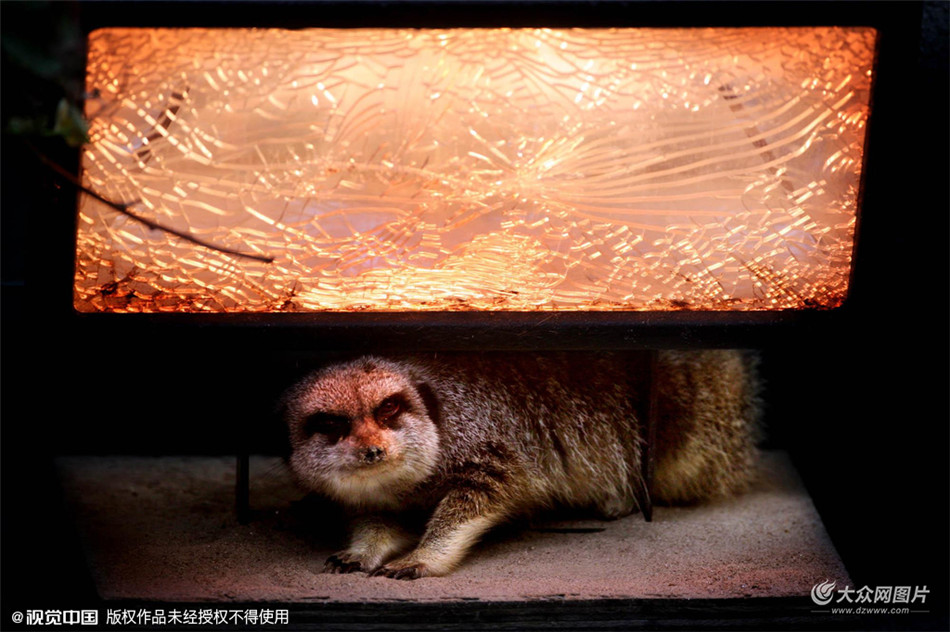 大眾網綜合消息 愛爾蘭都柏林動物園,一只海島貓鼬在燈光下棲息取暖。