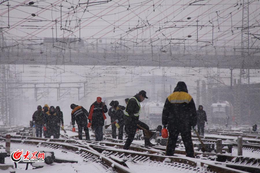 濟南鐵路局濟南工務段搶險小分隊在濟南站冒雪巡查線路設備。