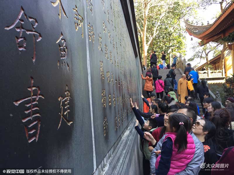 2016年02月11日,浙江省杭州市,游客為了祈福,著名寺院靈隱寺內(nèi)的一個(gè)刻有經(jīng)文的墻體被游客摸得掉色,墻體斑駁不堪。
