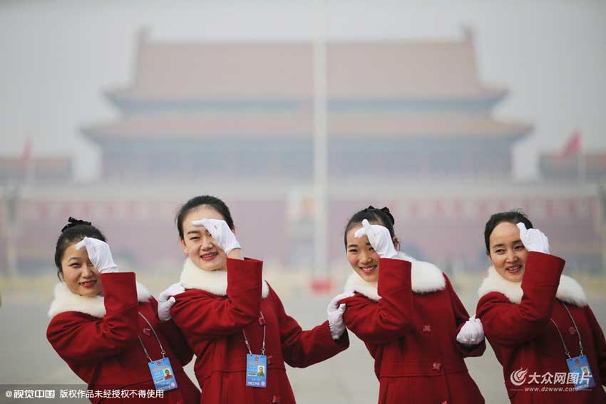 2016年3月3日,北京,全國政協十二屆四次會議開幕,服務人員擺姿勢拍照。