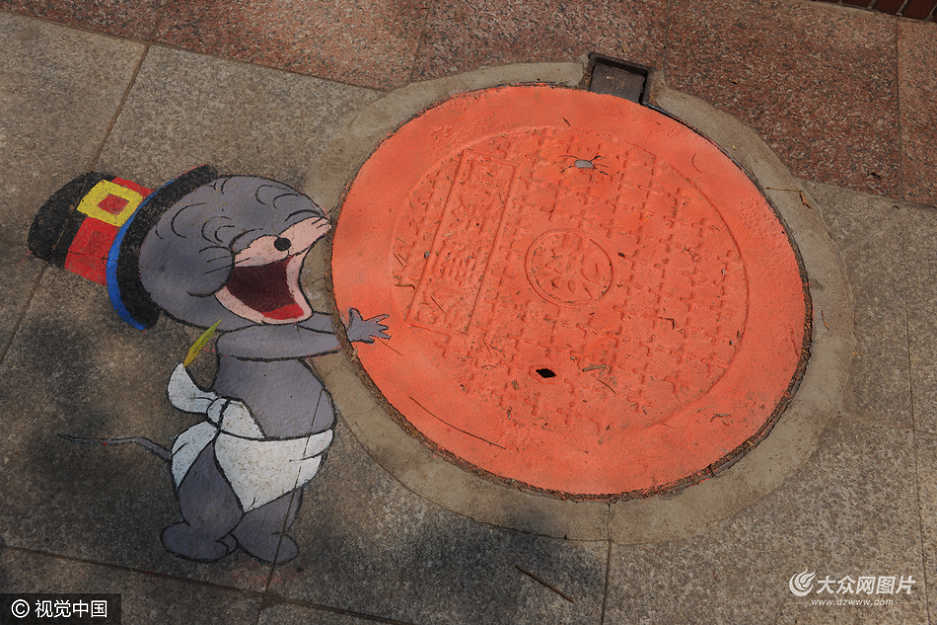 2016年6月01日,濟(jì)南,山東建筑大學(xué)校園內(nèi),近百井蓋被畫上涂鴉萌萌噠,吸引眾多大學(xué)生的眼球。