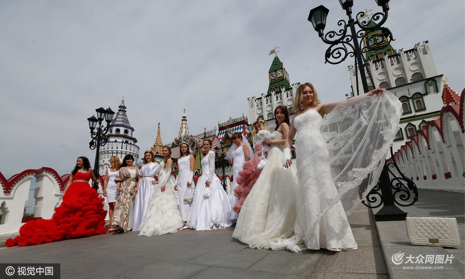 當地時間2016年6月19日,俄羅斯莫斯科,年輕女性盛裝打扮參加新娘游行。