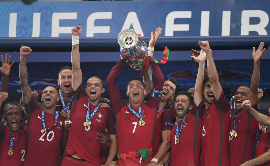 7月10日,葡萄牙隊球員克·羅納爾多在賽后慶祝奪冠。當日,在法國巴黎進行的2016年歐洲足球錦標賽決賽中,葡萄牙隊以1比0戰勝法國隊,奪得冠軍。