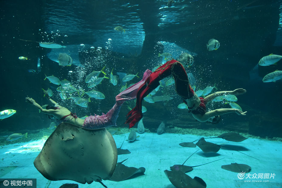 7月8日,在濟(jì)南一海洋世界,由6個姑娘進(jìn)行的美人魚表演正吸引著眾多游客的目光。跟著美妙的音樂,6條美人魚在水中自由翻飛,曼妙的身姿,完成著各種高難度動作,在觀眾的驚嘆中,她們?nèi)缇`一般,與海底瑰麗神秘的環(huán)境融為一體。