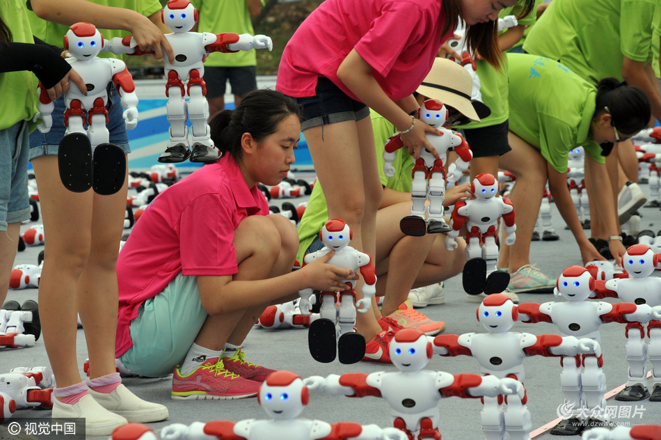 2016年7月30日,青島。青島啤酒節(jié)會(huì)場(chǎng),挑戰(zhàn)機(jī)器人同時(shí)跳舞的吉尼斯世界記錄成功,同時(shí)有1007個(gè)機(jī)器人同時(shí)跳舞,見證官現(xiàn)場(chǎng)頒發(fā)證書。