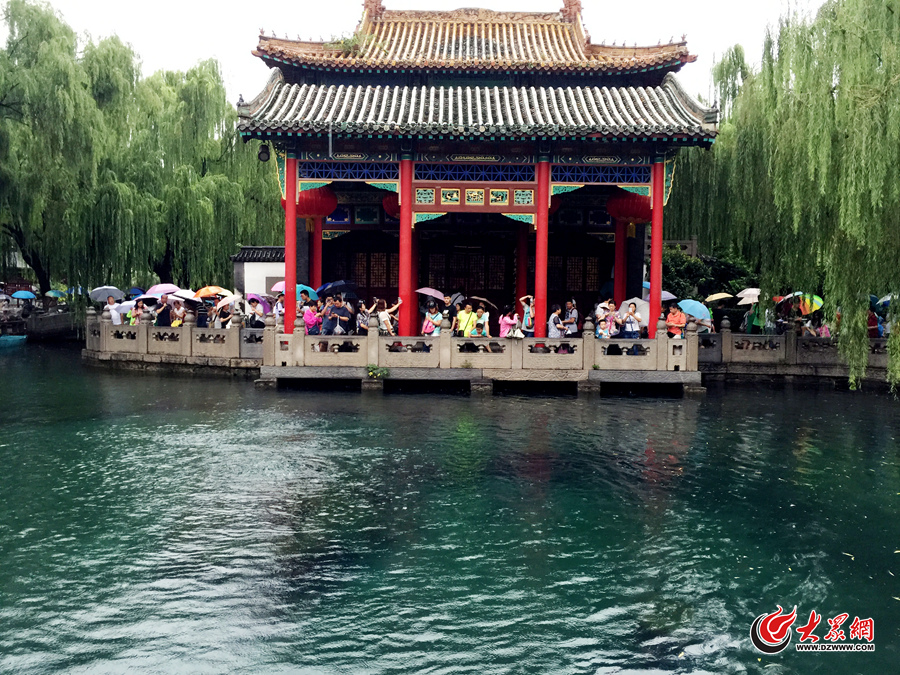 8月1日上午,濟南迎來降雨,商圈游客興致不減。圖為眾多游客在濟南趵突泉冒雨賞泉。大眾網(wǎng)記者 王長坤 馬俊驥 攝