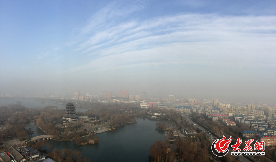 1月9日,山東濟南,頭頂上是湛藍的天空,甚至還飄著幾朵白云,但是記者從高樓處看卻是灰蒙蒙一片。根據預報9日空氣質量也將以中度污染為主,還有條“霾尾巴”,純凈的藍天白云好天氣還需再等等。大眾網記者 王長坤 攝