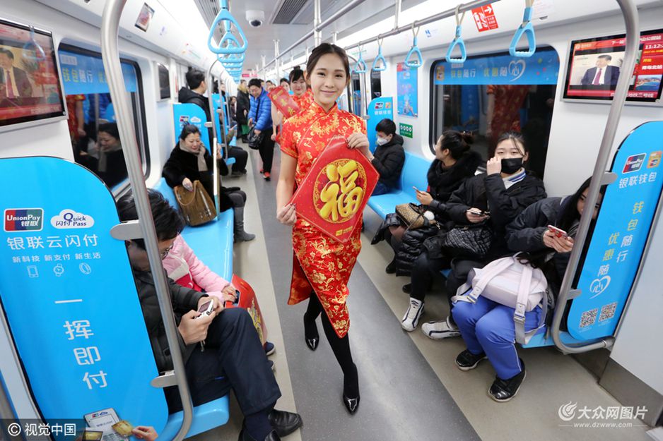 臨近年關,身著新春旗袍的銀聯禮儀小姐們來到地鐵上,為乘客帶來了福字和新春福袋,賺足了市民的眼球。