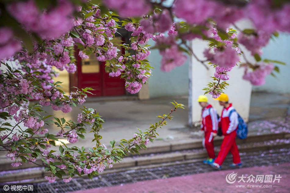 2017年4月17日,濟(jì)南,一場(chǎng)春雨過后,東部濟(jì)鋼新村體育館內(nèi)的櫻花林,櫻花花瓣落滿一地,粉紅色的花瓣浸染了綠色的草坪,市民花間行走,拍照留念。