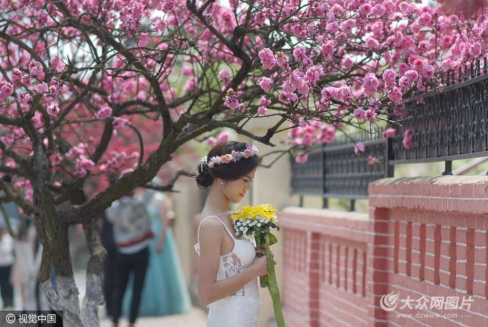 2017年4月17日,山東省青島市,被譽為“愛情圣地”的八大關景區迎來春花爛漫時節,櫻花欲謝桃花盛開,滿園春色吸引了眾多年輕人前來拍攝婚紗照,留下人生唯美的浪漫時光。