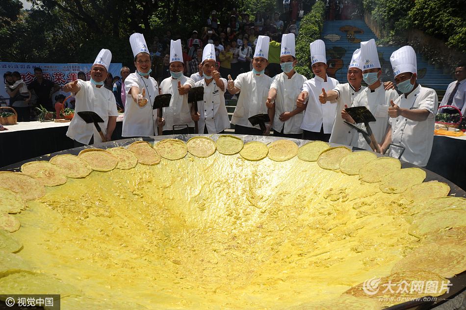 當(dāng)天上午,大廚們現(xiàn)場燒柴熱鍋,現(xiàn)場采摘新鮮藤三七葉,將1000多只新鮮有機(jī)土雞蛋、與藤三七葉榨汁攪勻,并倒入圓周直徑達(dá)3米、縱深近0.8米的巨型大鍋中,一群廚師手持1.8米的大鐵鏟,分工合作、同時煎蛋。由于巨鍋呈凹型,煎制過程非常考驗功夫,大廚們要時刻注意火候和時間,確保鍋底不糊保證口感,還要煎成一個完整而美味的超級大蛋餅。