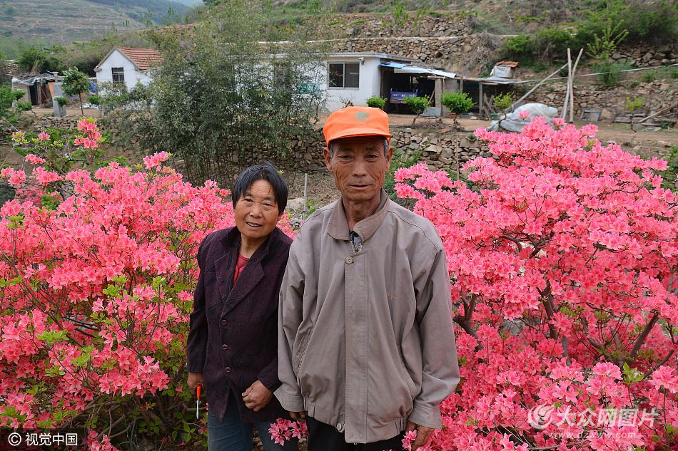 2017年4月25日,山東日照。今年63歲的李吉祥和67歲的許傳美,是山東省日照市九仙山風(fēng)景區(qū)內(nèi),位于大山深處的宣王溝村人。從1998年開始,夫妻兩人在離村子?xùn)|南2里多的自家口糧地,以及山澗地頭上,栽種培育了近百畝杜鵑花和金銀花,花開時(shí)節(jié),杜鵑花和金銀花競相綻放,花香四溢,蜂蝶飛舞,使昔日的荒山變成現(xiàn)在的“私家花園”,成為九仙山景區(qū)內(nèi)一道亮麗的景觀。