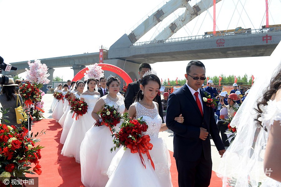 2017年4月26日,山東濱州,濟青高鐵中建三局項目部鄒平跨濟青高速特大橋工地,16對新人手挽著手走進工友們在工地為他們精心設置的婚禮現場,舉行集體結婚典禮。