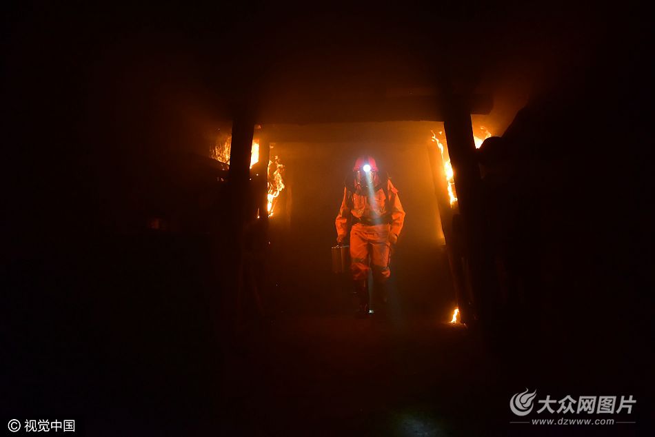 烈焰吐著火舌,煙霧籠罩,現(xiàn)場能見度不足兩米,溫度高達(dá)60攝氏度,幾名身穿橘黃色工作服面部佩戴著呼吸器的救護(hù)隊員背負(fù)著30多公斤的設(shè)備,在低矮的巷道來回穿梭,營救傷者。眼前的這一幕,是山東能源淄礦集團(tuán)礦山救護(hù)大隊的日常訓(xùn)練。