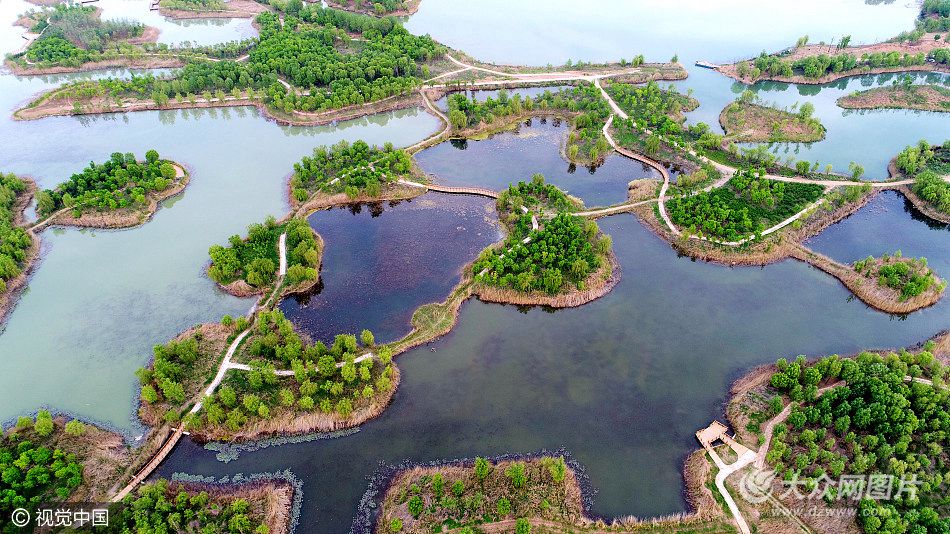 2017年4月26日,山東省濟(jì)南市的濟(jì)西國家濕地公園內(nèi),港汊縱橫,水流清冽,交織形成大小島嶼近100座,堪稱西城“百島湖”。