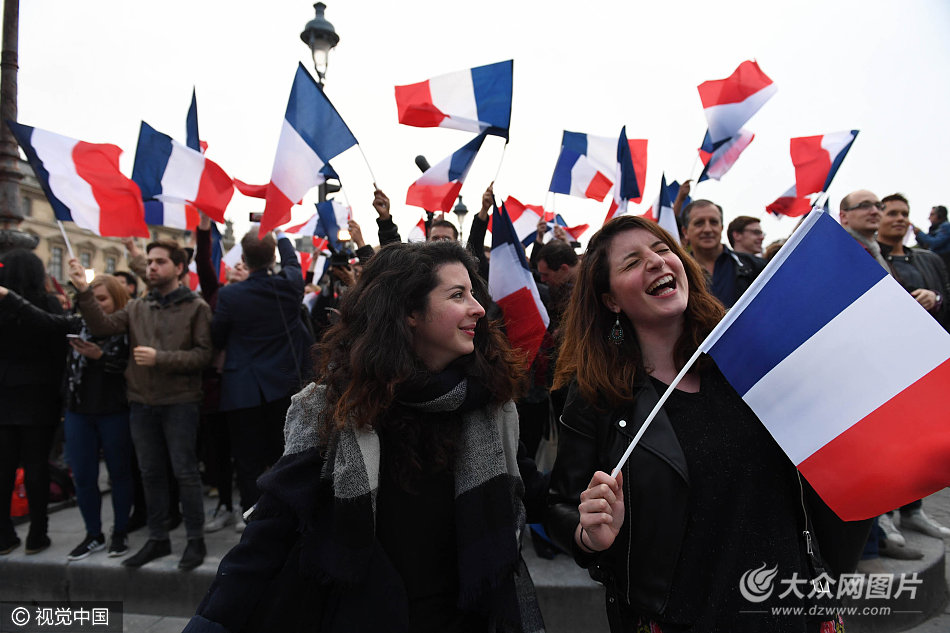 當地時間2017年5月7日,法國巴黎,民眾慶祝馬克龍在2017年法國總統大選中獲勝。