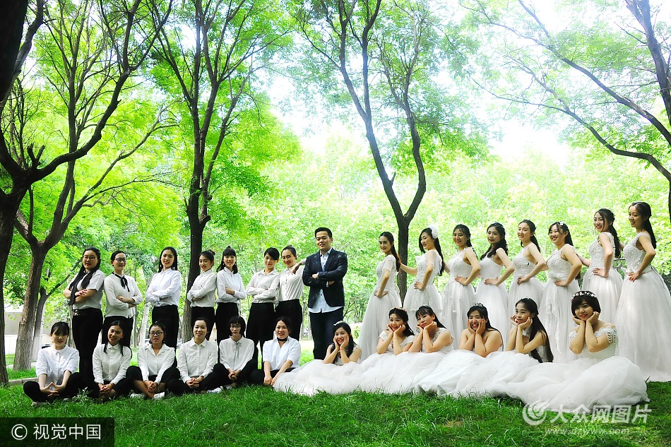 2017年5月15日,濟南,在山東財經大學舜耕校區,27位女生穿著婚紗、禮服和班里的唯一一位男生照畢業照。又是一年畢業季,在濟南的諸多大學校園里,到處都能捕捉到畢業生的笑臉。除了院校正統的大合影,各種風格的花式畢業照也層出不窮。據悉,他們是該校英語系的學生。全班共28名學生,就唯一一位“蔥花”。大學四年,他“享受”了其他院系男生永遠不可能有的“待遇”。