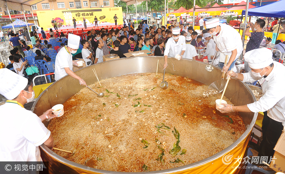2017年5月20日,南寧。一人多高的大鍋內(nèi),800多斤米粉與上千斤的配料,煮出了史上最大碗的老友粉,近千市民見證了這一盛舉,同時(shí)也分享到這碗巨無(wú)霸老友粉的美味。