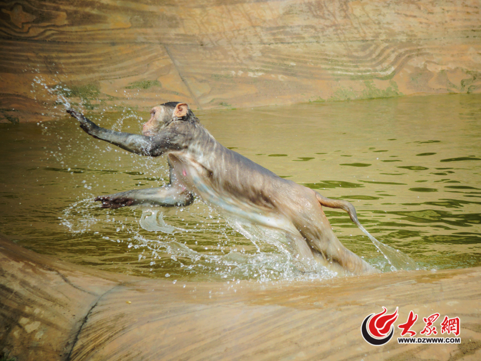 5月28日,山東濟南繼續高溫天氣,最高氣溫達到37℃,在濟南野生動物世界里,動物們喜過“潑水節”,老虎、大象、猴子等動物沖涼泡澡消暑降溫。圖為一只獼猴在水池中嬉水納涼。