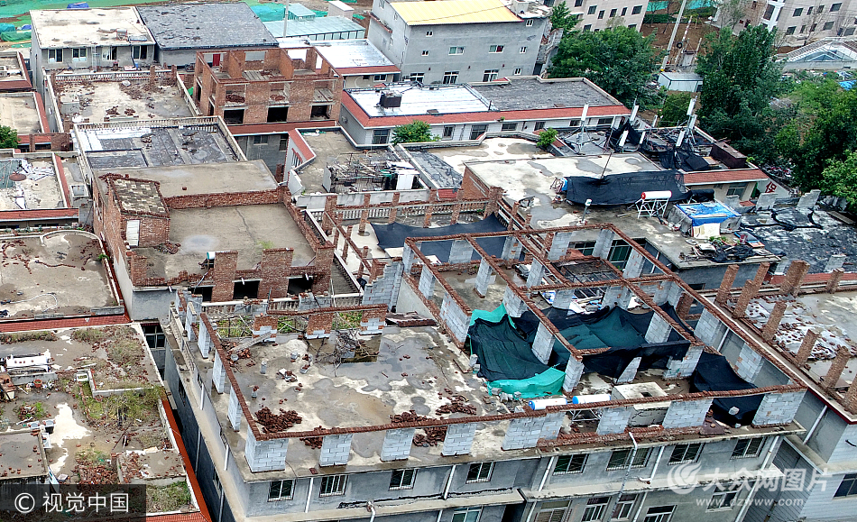 2017年6月6日,山東省濟南市,在二環南路東首興隆村,村里很難見到平房,大部分居民對原有房屋進行了加蓋或重建,其中不少樓房只建起了主體框架,外墻裸露著紅磚,并沒有安裝窗戶或居住。