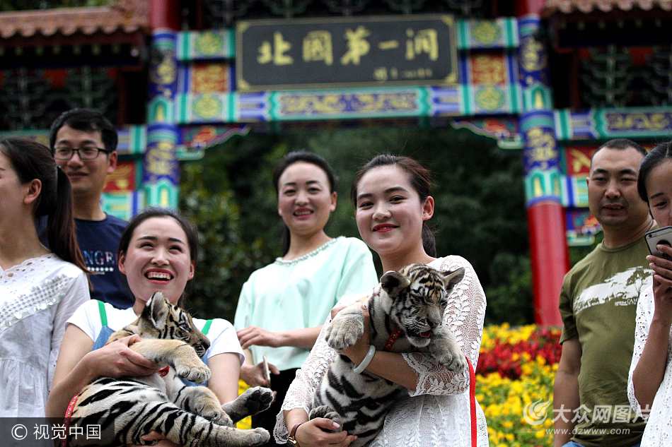 2017年6月22日,河南洛陽伏牛山地質公園雞冠洞園區,姑娘們帶著倆老虎遛彎散步,小老虎們十分溫順,模樣呆萌可愛,有時還會和大家玩耍。