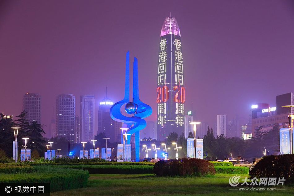 濟南第一高亮燈祝福建黨96周年和香港回歸20周年
