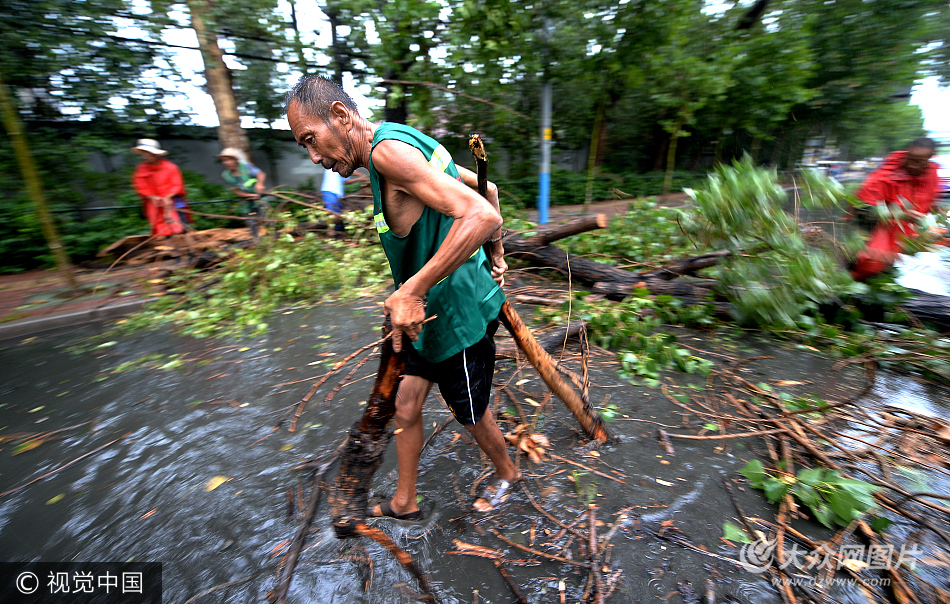 2017年7月18日,山東省濟南市,大風伴隨著急雨突襲而至,瞬間風力超過6級,市區不少道路兩側的大樹被風刮倒。搶險人員進行搶險。
