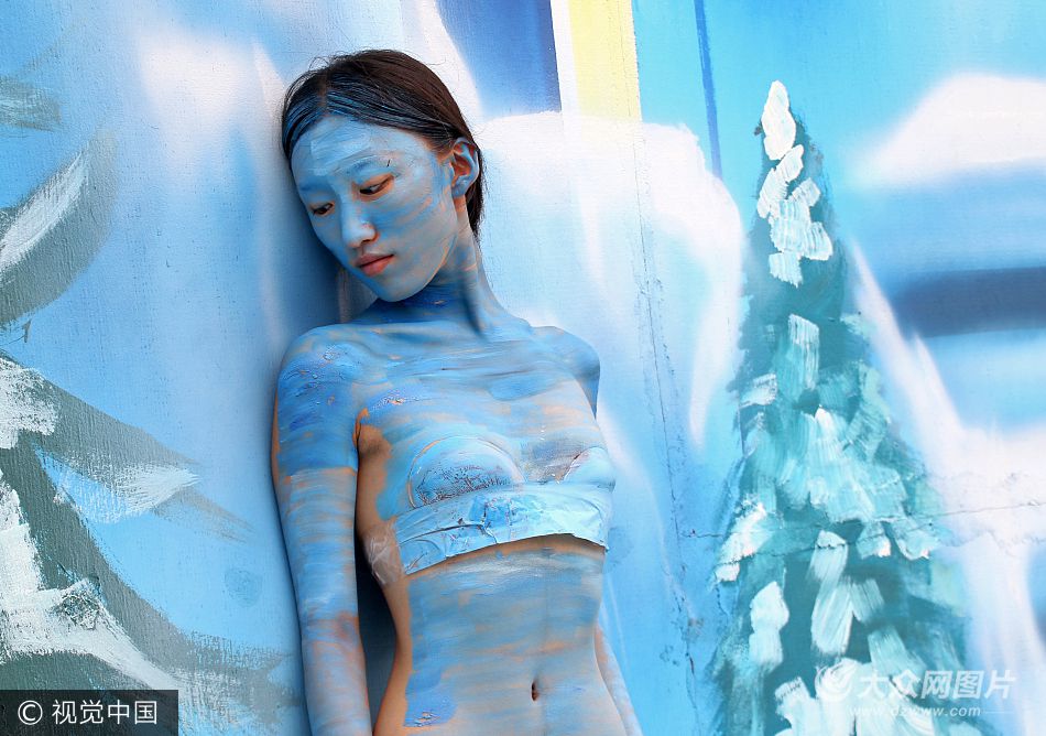 2017年8月3日,在山東煙臺(tái)某樂(lè)園,彩繪師以性感女模為“畫布”,將景區(qū)風(fēng)光與人體彩繪藝術(shù)融合,創(chuàng)造出能夠“隱身”于環(huán)境的人體彩繪,將人體彩繪玩出了新花樣。