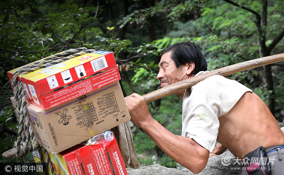 高大險峻的泰山上,一名挑山工的身影吸引了眾多游客的眼球。這名挑山工叫王懷玉,今年47歲。他的工作是挑著130多斤重的飲料從中天門出發一路登山為沿途商家送貨,一趟下來大約需要2個小時,按照每斤飲料3毛錢的勞務費計算,他大約能賺40元錢。