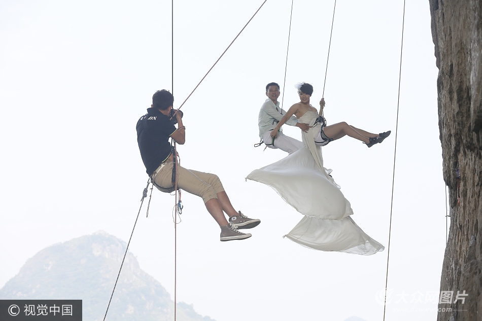 2013年10月26日,廣西柳州,方靜穿著婚紗,和先生掛在空中拍攝婚紗照。攝影師也吊在空中拍攝。