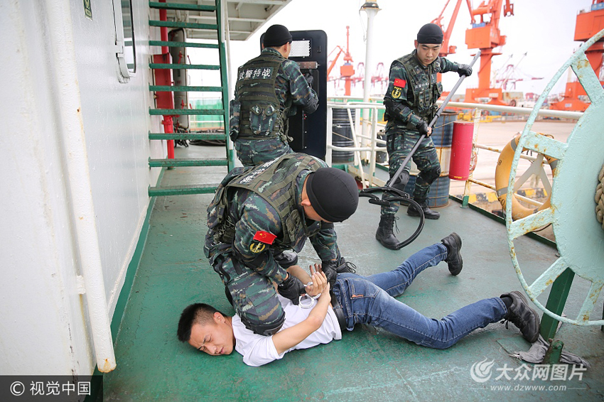 黃島邊防檢查站的防爆隊員在被“劫持”的貨輪上擒拿暴恐分子。