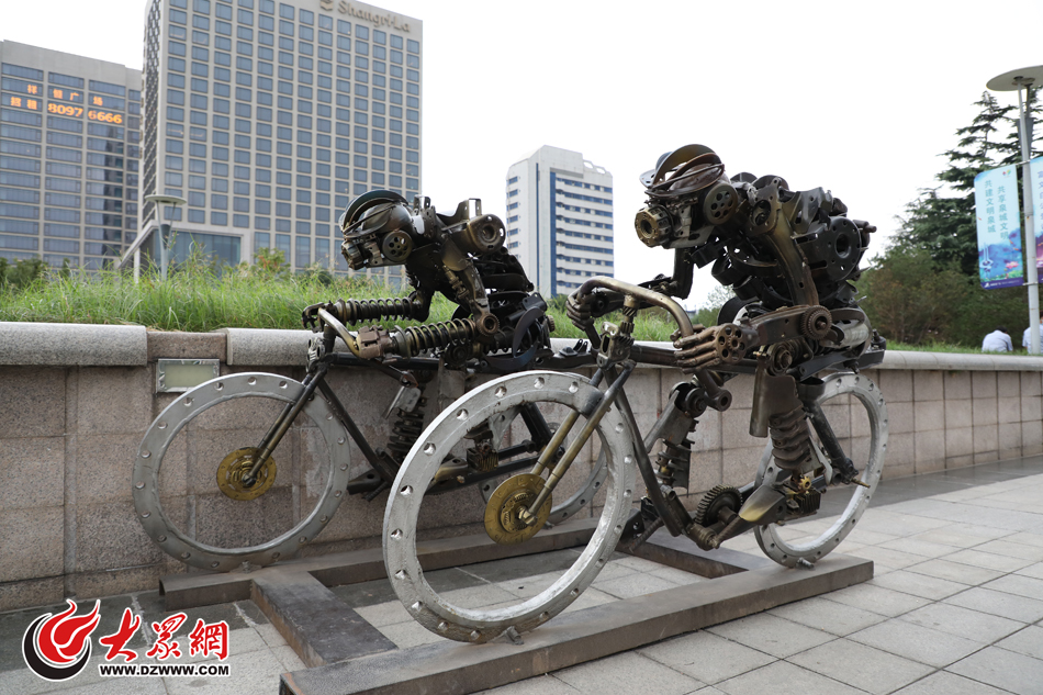 大眾網9月4日濟南訊 近日,濟南泉城廣場中多了很多鋼鐵做成的雕塑,據了解,這些雕塑都是用廢舊的汽車零件和其他零件拼接而成,因為造型各異,有不少市民圍觀。(亓翔 攝)