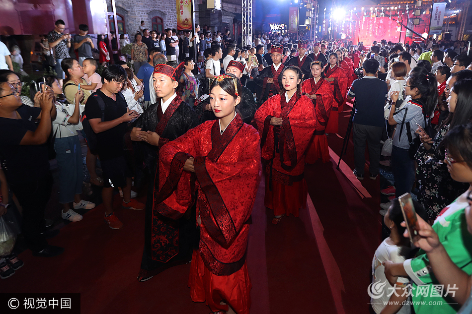 2017年9月23日,在濟(jì)南寬厚里上演了一場(chǎng)穿越古今的集體婚禮,數(shù)十名情侶身著漢服行解纓結(jié)發(fā)等古代儀禮,再現(xiàn)漢唐古韻。