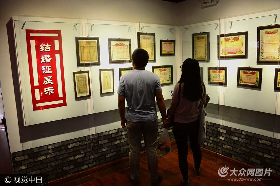 大眾網10月7日訊 10月6日,山東聊城一博物館內展出各個年代結婚證,展出的結婚證共有30多張,時間跨度從民國時期到上世紀八十年代。這些結婚證外觀酷似獎狀,時代特征明顯吸引了不少游客觀看拍照。圖片作者:王登虎/視覺中國