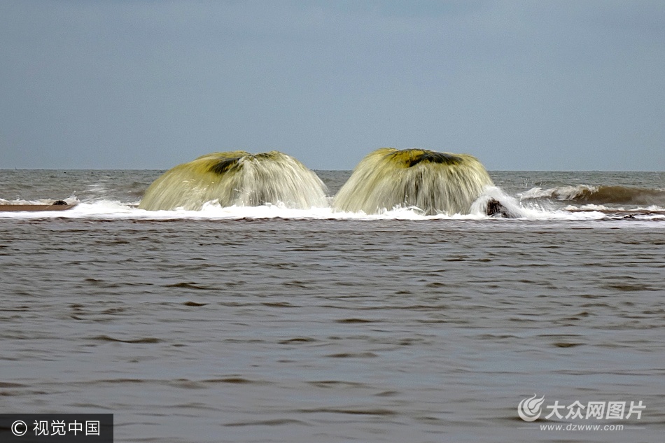 當日是農歷八月十九,青島靈山灣中午落大潮時分,距離岸邊約200米的三個市政雨水排放口裸露在海灘上。經歷了大半天小雨之后,城市低洼地段積滯的雨水從海上雨水排放口排出狀如“蘑菇泉”,格外引人注目。