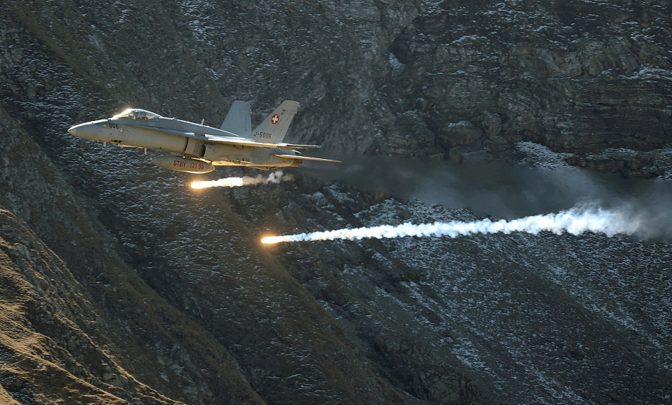 瑞士空軍在阿爾卑斯山區訓練 發射照明彈好似焰火表演