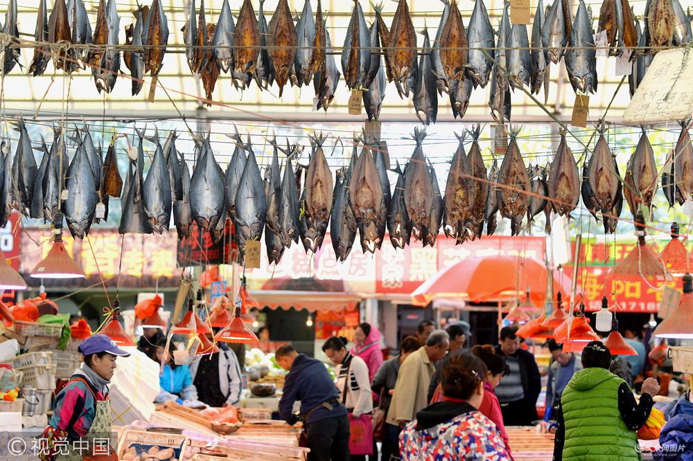 2017年10月23日,山東省青島市,秋鲅魚大量上市進入晾曬季節,市民開始在市場上選購鲅魚制作成美味魚干食用,或作為禮物送給親朋好友。懸掛在市場上的“空中美味”散發著花椒和魚的鮮香,成為一道青島民俗風景。